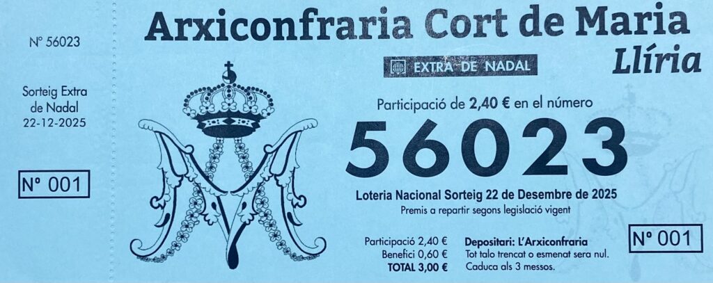 Desde el día 18 de septiembre hasta el 11 de diciembre, en horario de 18:30 a 20:00, se podrá adquirir la lotería de la Archicofradía en la Sala de Juntas de la Corte de María.
