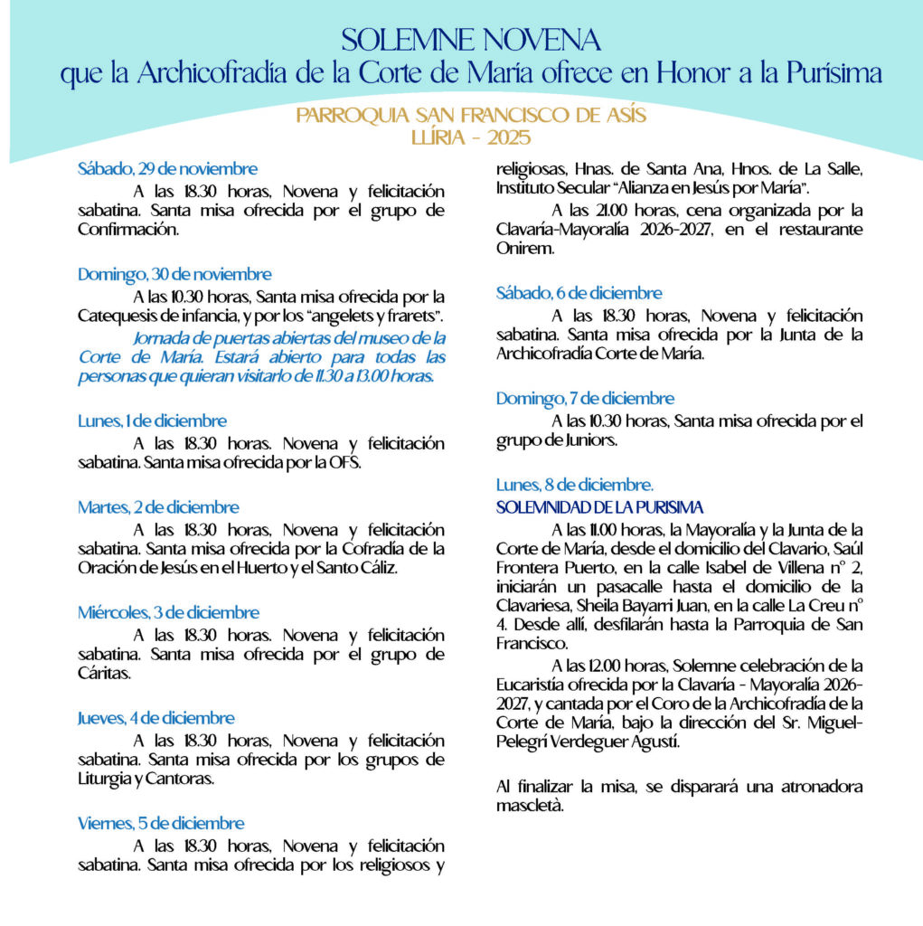 Como cada año, el 29 de noviembre da inicio la Novena a la Purísima. A lo largo de 9 días consecutivos, estamos llamados a prepararnos para el día más especial de la Archicofradía, el 8 de diciembre, un día que esperamos con especial ilusión los que sentimos auténtica devoción a la Purísima.