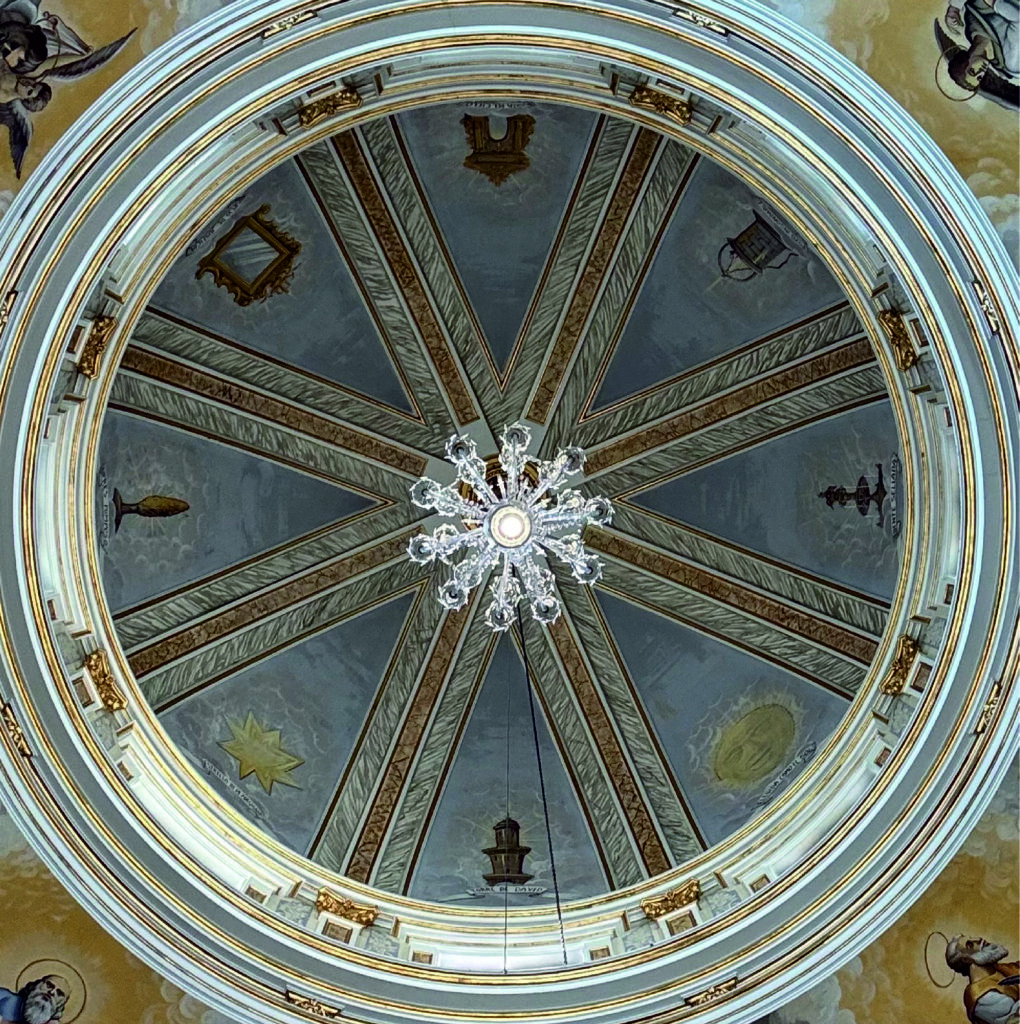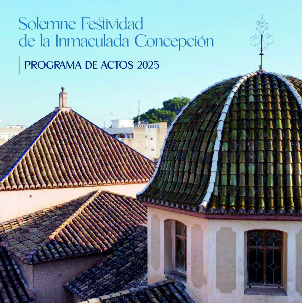 Este año, la portada del díptico es la fotografía exterior de la cúpula de la Capilla de la Purísima, en cuyo proyecto de restauración nos encontramos inmersos y que será realidad en el 2026. La contraportada hemos querido dedicarla a la lámpara cenital de la Capilla restaurada en este 2025.