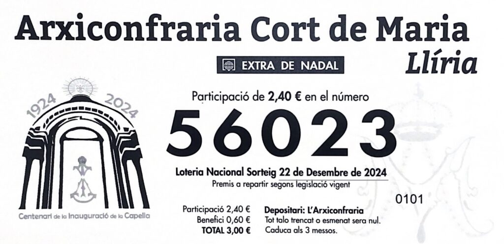 Desde el 26 de septiembre hasta el 12 de diciembre, todos los jueves de 18:30 a 20:00 horas, en la Sala de Juntas de la Archicofradía de la Corte de María, se puede adquirir la lotería de Navidad.