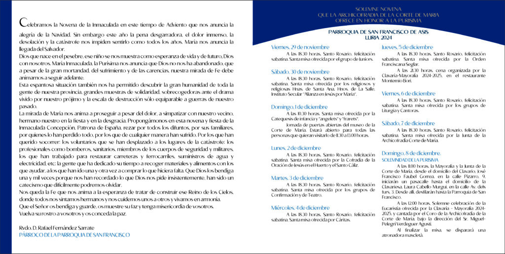 El 29 de noviembre de cada año da inicio la Novena a la Purísima. Durante nueve días consecutivos, estamos llamados a prepararnos para el día grande de la Archicofradía, el 8 de diciembre, un día que esperamos con anhelo los que sentimos auténtica devoción a la Purísima.
